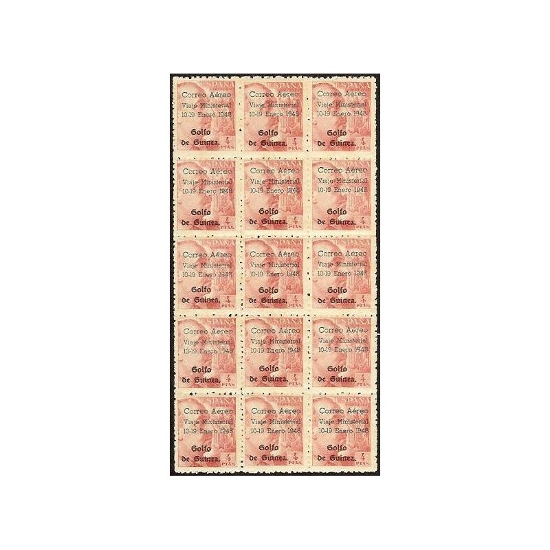 Sellos de España habilitados. General Franco. Viaje ministerial. Correo aéreo. Precioso bloque de 15 del tipo II presenta excelente centraje. Tirada de 5.000 ejemplares. Lujo.