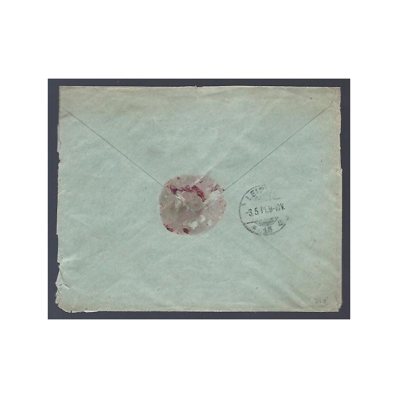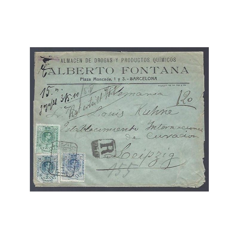 1911 Barcelona-Leipzig. Correo certificado a Alemania. Carta franqueada con un 5c. verde, un 25c. azul y un 50c. azul de la serie "Alfonso XIII. Tipo medallón". Matasellada con fechadores de origen y de llegada. Marca negra "R/ESPAGNE". Lacre en el reverso.