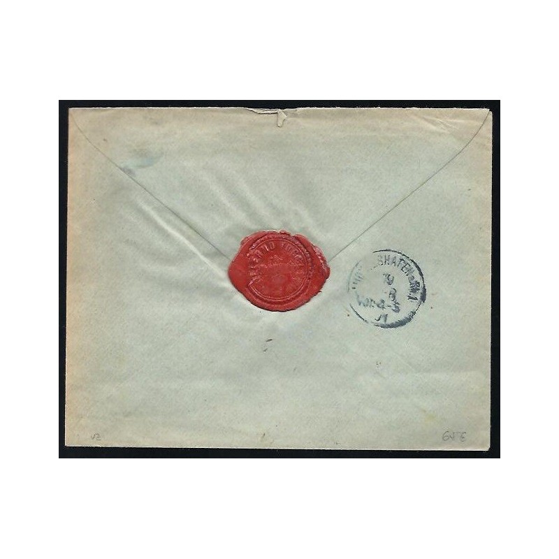 1901 Madrid-Ludwigshafen. Correo certificado destino Alemania. Carta franqueada con un 50c. azul verdoso. Matasellos CERTIFICADO/MADRID. Etiqueta R/CERTIFICADO/Nº112/MADRID. Marca CERTIFICADO en color azul. Fechador de llegada de Ludwigshafen. Lacre en el reverso.