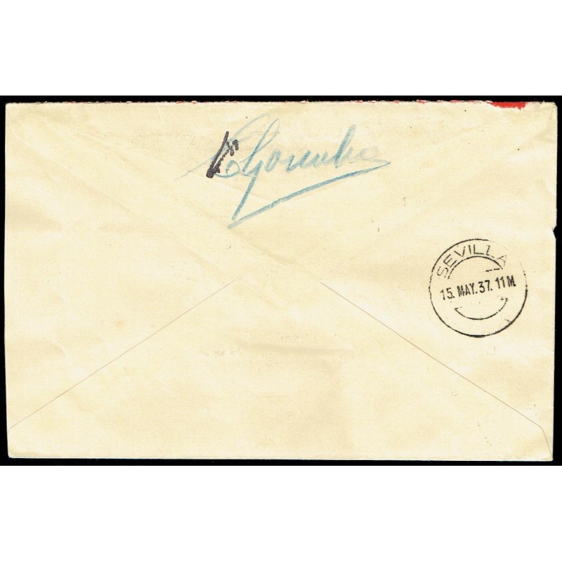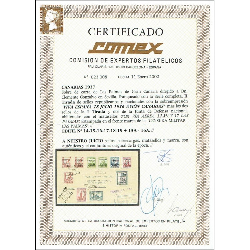 Sellos republicanos y nacionales habilitados para correo aéreo. Correo aéreo circulado de Las Palmas a Sevilla el 12 de Mayo de 1937. Franqueado con la serie completa (Tiradas I y II), complementado con ED. 806/807. Matasellado con fechadores de origen y de llegada. Marca "Censura Militar Las Palmas". Dirigido a Don Clemente Gonzalvo (firma del mismo en el reverso). Certificado Comex. Muy raro.