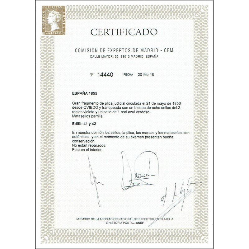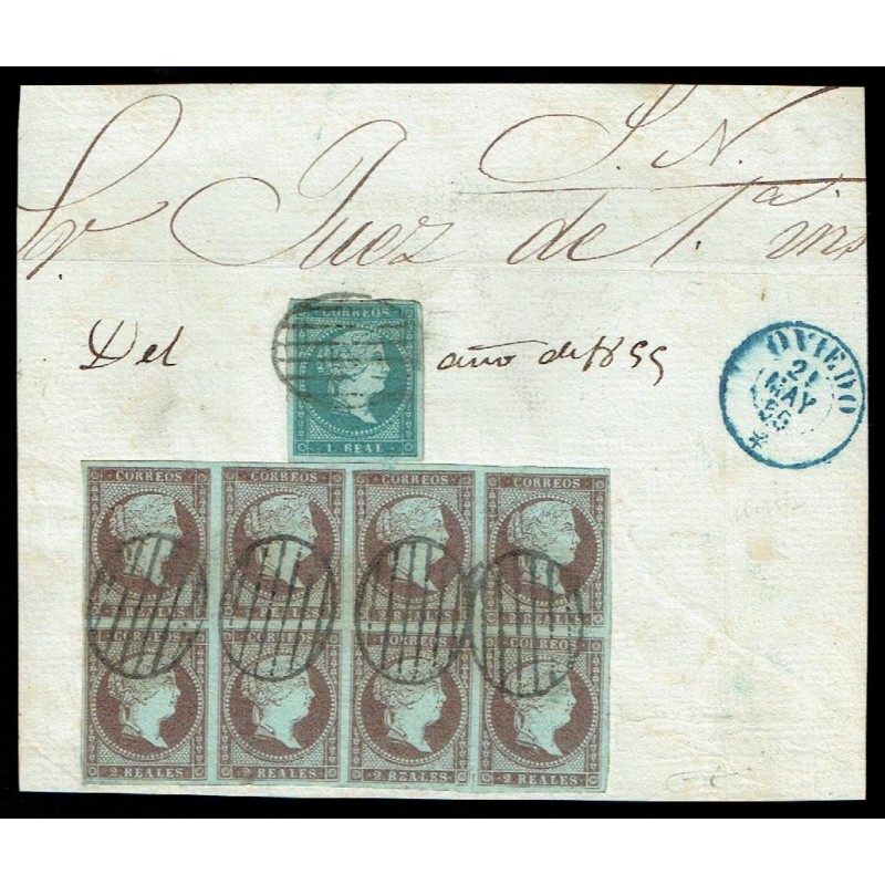 1855 Origen Oviedo. Precioso fragmento de plica judicial franqueado con un 1 real azul verdoso y un bloque de ocho 2 reales violeta. Matasellos de parrilla de seis líneas en color negro y fechador de origen azul del 21 de Mayo. Certificado C.E.M.