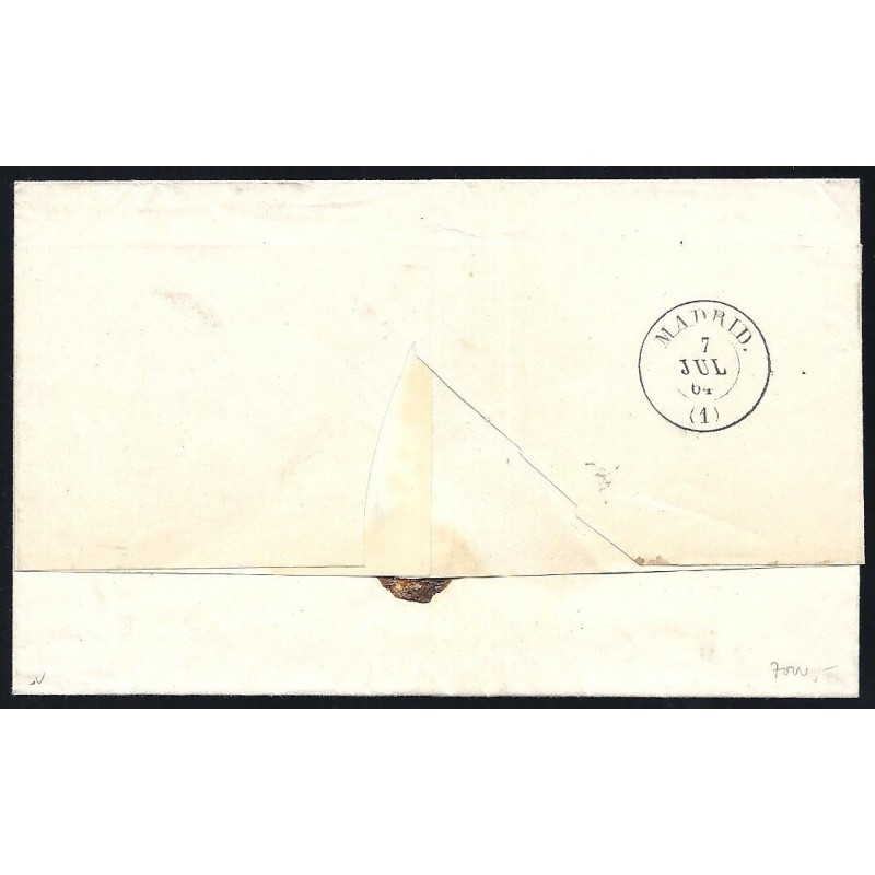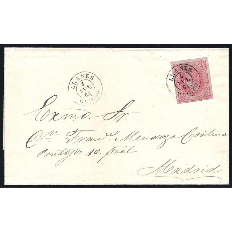 1864 Llanes (Asturias)-Madrid. Envuelta franqueada con un 4 cuartos rojo sobre salmón, matasellada con fechadores de origen "Llanes / Oviedo" del 5 de Julio de 1864 y de llegada el día 7 en el reverso.