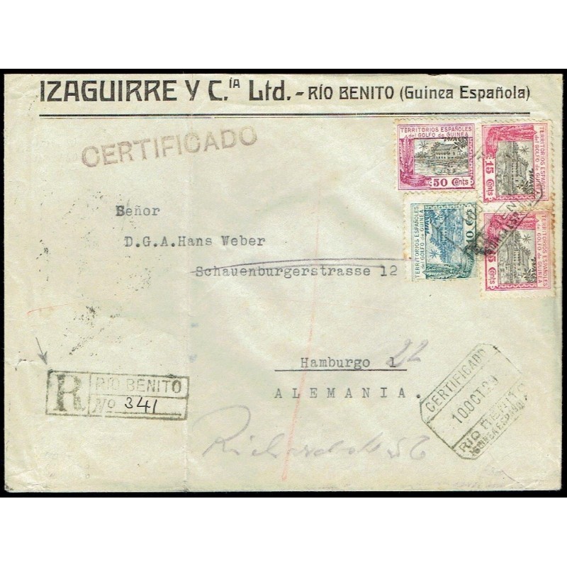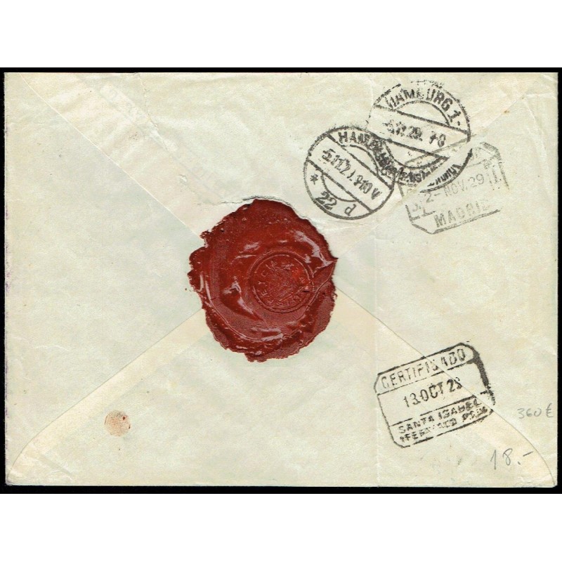 1929 Río Benito (Guinea Española)-Hamburgo (Alemania). Carta certificada matasellada con fechadores de origen del 10 de Octubre de 1929, de tránsito de Santa Isabel (Fernando Poo) el 13 de Octubre, de Madrid el 2 de Noviembre, y finalmente de llegada el día 5 de Noviembre. Lacre en el reverso.