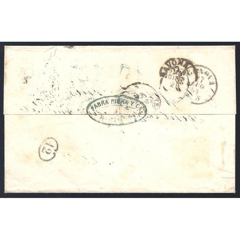 1869 Barcelona-Génova (Italia). Envuelta franqueada con una pareja de 100 milésimas de escudo castaño. Matasellos de parrilla con cifra número "2" y marca "P.D." en color azul. Fechadores de origen y de llegada en el reverso. Muy rara.