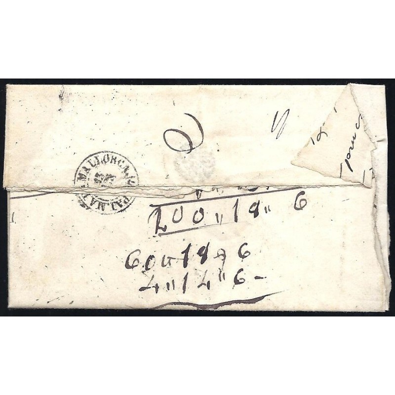 1869 Algaida-Palma. Correo Interior de Palma de Mallorca. Carta franqueada con un 50 milésimas de escudo violeta. Matasellos de "Cartería de Algaida", fechador de origen y de llegada en el reverso.