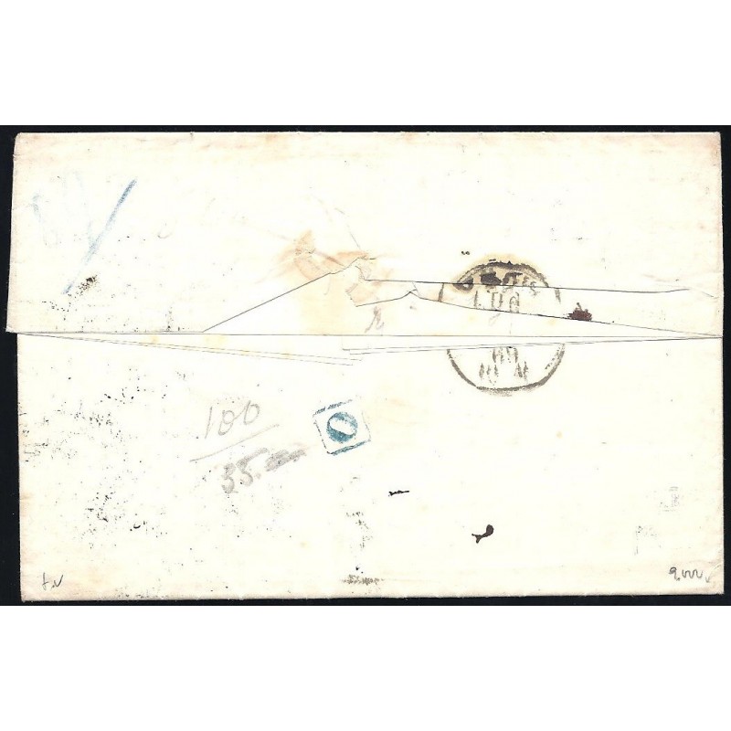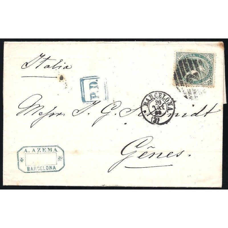 1869 Barcelona-Génova (Italia). Carta franqueada con un 200 milésimas verde. Matasellado con la Parrilla con cifra número 2, fechador de origen del 20 de Julio con el mes invertido y de llegada en el reverso. Marca francesa "P.D." (Payé destination) azul.