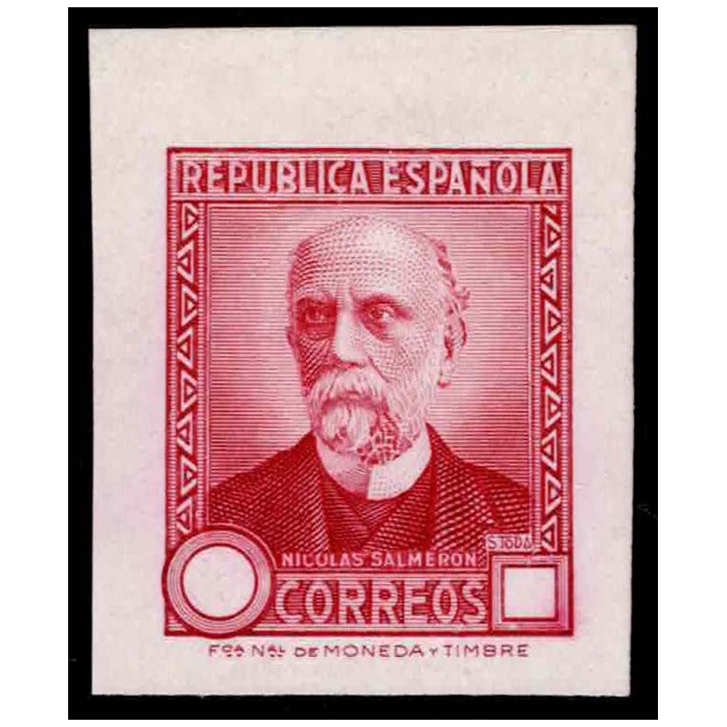 Personajes y monumentos. Nicolás Salmerón. Preciosa prueba en carmín-lila con pie de imprenta sin valor sobre papel grueso del 50 Céntimos naranja. Catalogada Gálvez Pruebas 3026.