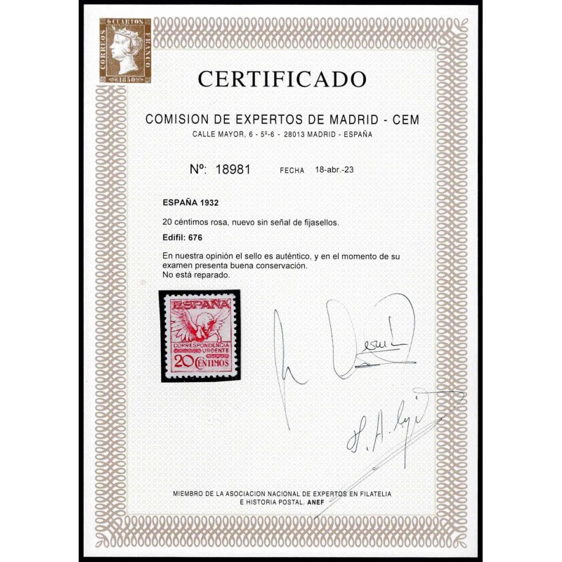 Pegaso. Precioso 20 Céntimos rosa para Correspondencia Urgente nuevo presenta magnífico centraje. Lujo. Certificado C.E.M.