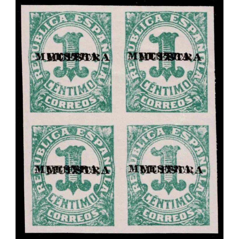 Cifras. Muy raro bloque de 4 del 1 Céntimo verde-azulado para impresos MUESTRA habilitación doble con perfiles en negro nuevo presenta amplios márgenes. No catalogado sin señal de fijasellos. Lujo.