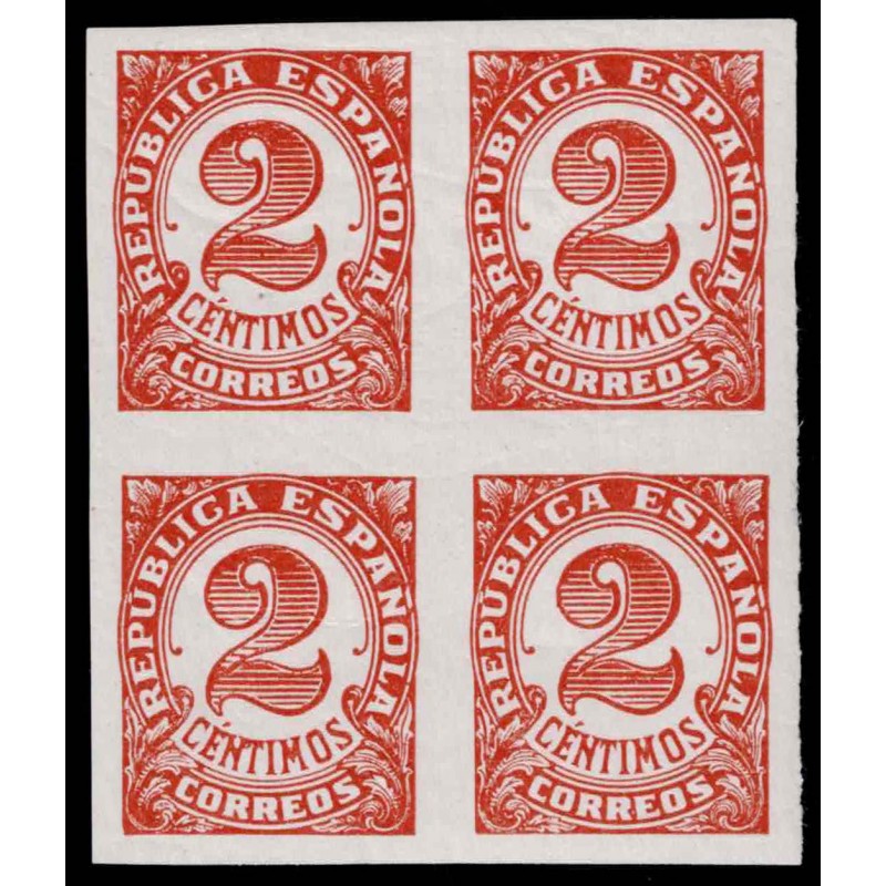 Cifras. Muy raro bloque de 4 del 2 Céntimos castaño-rojizo para impresos sin dentar nuevo presenta amplios márgenes. Lujo.