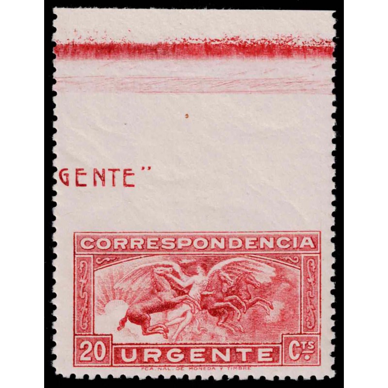 Ángel y caballos. Raro 20 Céntimos carmín para Correspondencia Urgente de gran formato con variedad de perforación sin dentar el margen superior nuevo con borde de pliego y leyenda incompleta "URGENTE" presenta magnífico centraje. Gran lujo.