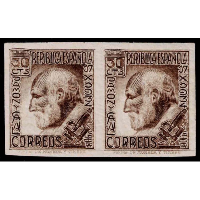 Santiago Ramón y Cajal. Muy rara pareja horizontal del 30 Céntimos castaño-grisáceo sin dentar nueva presenta amplios márgenes.