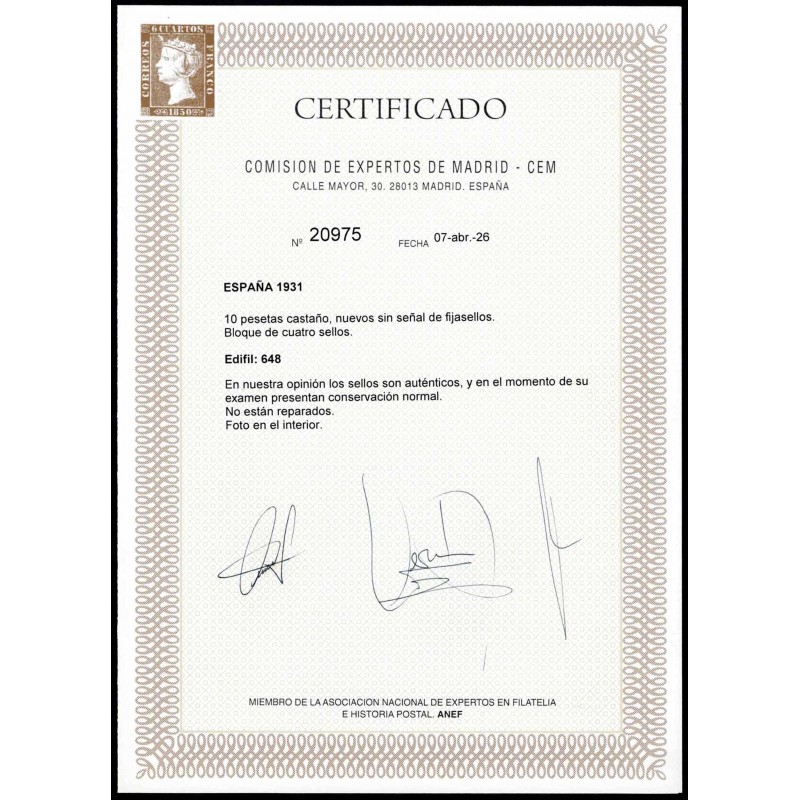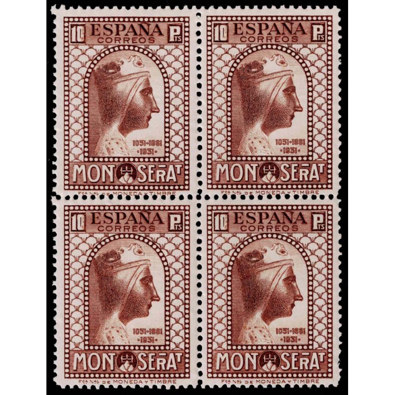 IX Centenario de la fundación del Monasterio de Montserrat. Espectacular bloque de 4 del 10 Pesetas castaño segundo valor clave de la serie nuevo presenta magnífico centraje. Gran lujo. Certificado C.E.M.