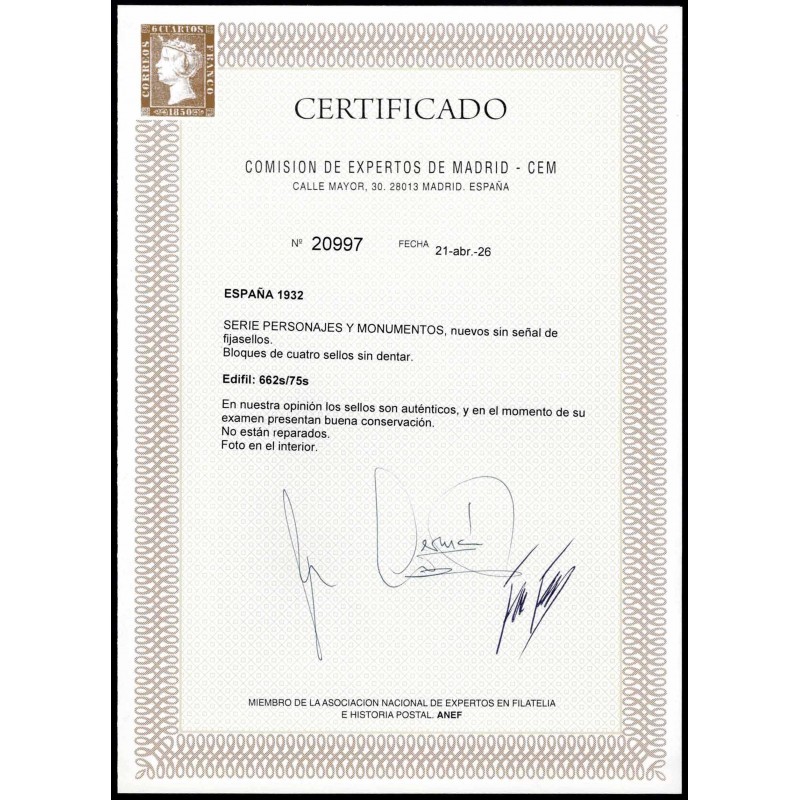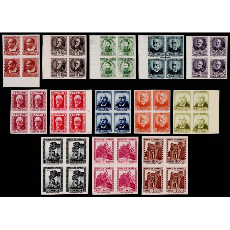 Personajes y monumentos. Rarísima serie completa sin dentar en bloque de 4 nueva con bordes de pliego presenta buenos márgenes. No catalogada sin señal de fijasellos. Lujo. Certificado C.E.M.