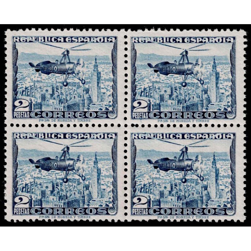Autogiro de Juan de la Cierva. Raro bloque de 4 del 2 Pesetas azul nuevo presenta excelente centraje. Lujo.