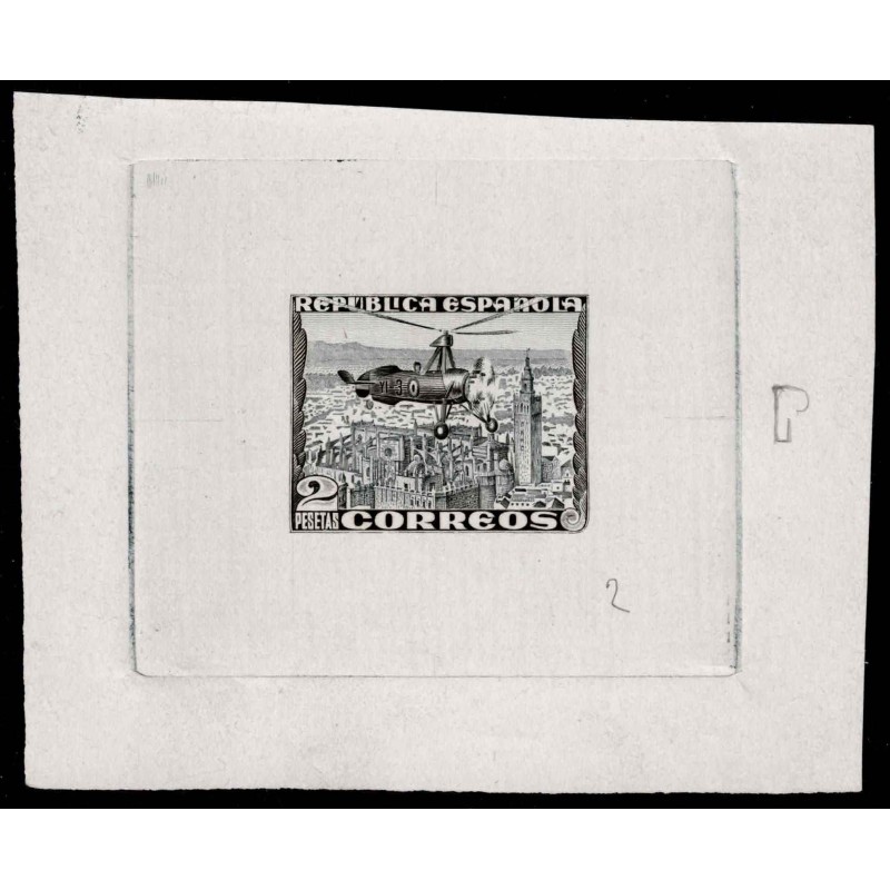 Autogiro de Juan de la Cierva. Muy rara prueba en negro sobre papel grueso del 2 Pesetas azul.