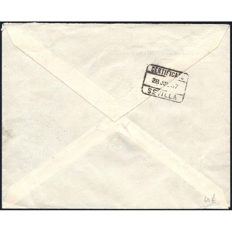 Sellos republicanos sobrecargados. Espectacular franqueo sobre carta certificada circulada de Jerez de la Frontera a Sevilla el 27 de Julio de 1937. Franqueada además con un 5c. de la Diputación Provincial de Cádiz. Matasellada con fechadores de origen y de llegada. Marca de censura militar. Rara.