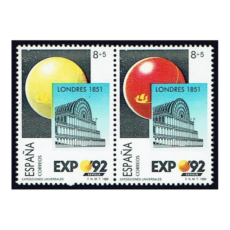 Exposición Universal de Sevilla EXPO'92. Preciosa pareja con el primer valor variedad de impresión sin el color rojo y el segundo valor variedad con el color rojo desplazado a la derecha. Certificado Graus.