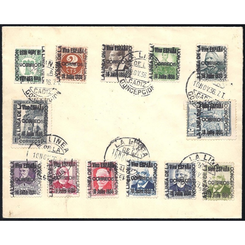 Sellos republicanos sobrecargados. Carta franqueada con 13 valores de la serie, incluidos No Expendidos. Matasellos de favor de La Línea de la Concepción (Cádiz) del 10 de Noviembre de 1936.