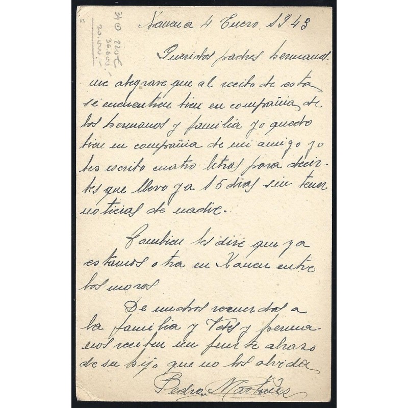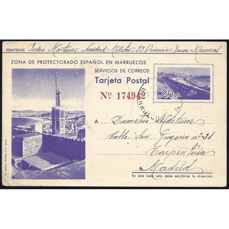 Paseo marítimo de Tánger y Vistas. Protectorado Español en Marruecos. Tarjeta 20c. azul circulada de Xauen (Marruecos) el 4 de Enero de 1943 a Madrid. Matasellada con fechador de origen y marca violeta ilegible "Intervencción ...". Impreso en offset por Rieusset S.A., Barcelona. Cartulina crema. Tirada de 62500. Raro.