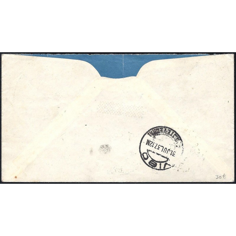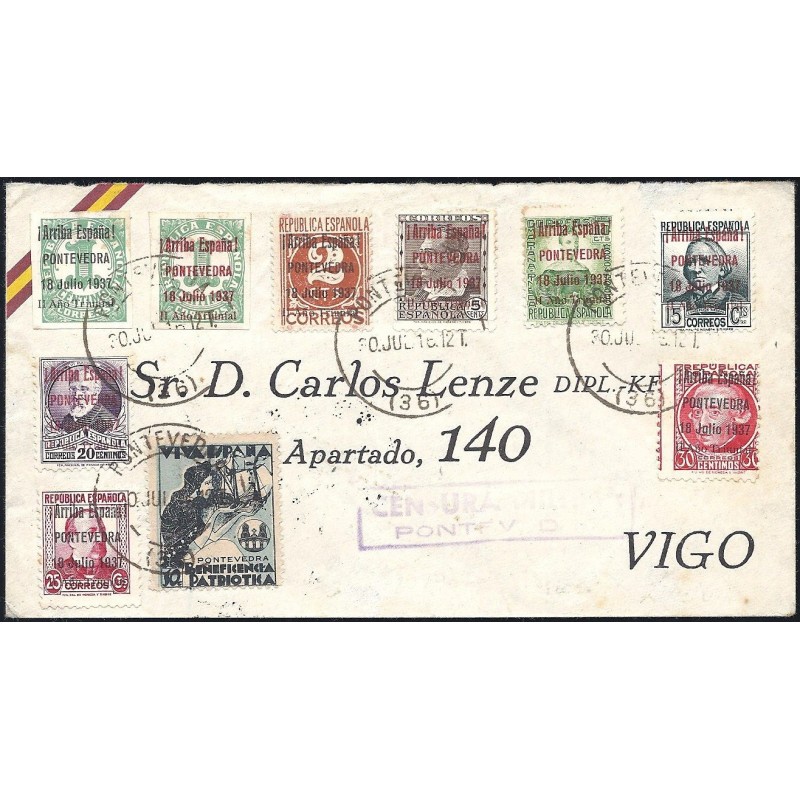 Sellos republicanos sobrecargados. Carta circulada de Pontevedra a Vigo el 30 de Julio de 1937. Franqueada además con un 10c. benéfico. Matasellada con fechadores de origen y de llegada. Marca de censura militar.