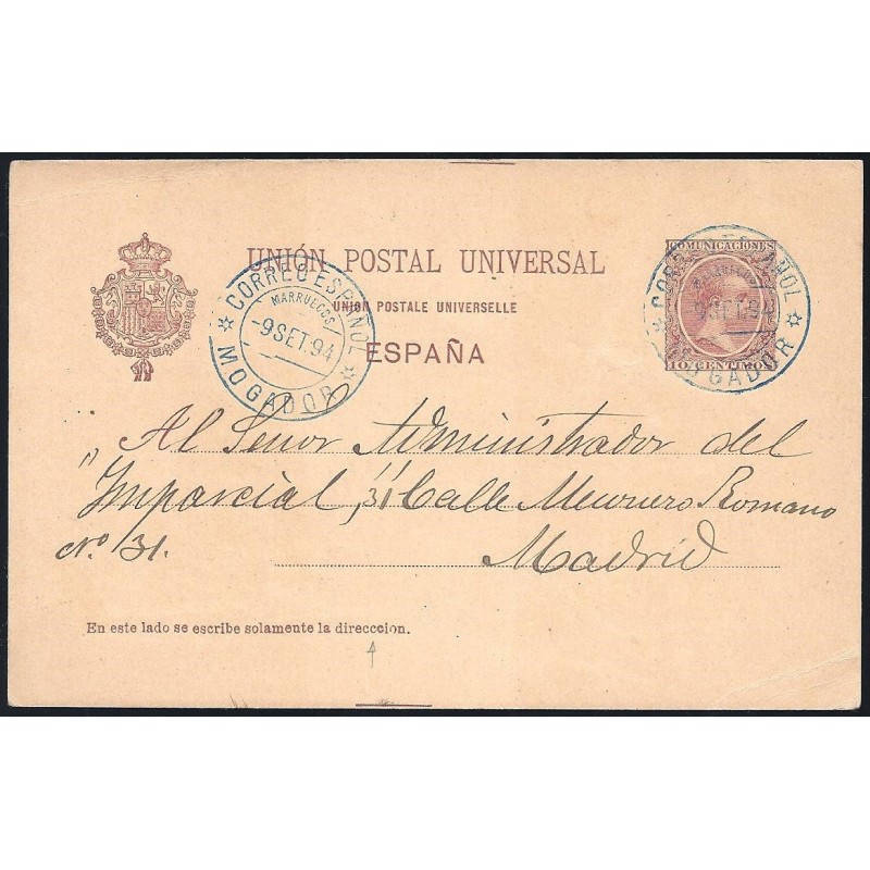Alfonso XIII. Tipo Pelón. Correo español en Marruecos. Tarjeta 10c. carmín sobre anteado circulada de Mogador (Marruecos) el 9 de Septiembre de 1894 a Madrid. Matasellada con fechador de origen y de tránsito en Algeciras el día 17. Diseño de Eugenio Juliá. Impreso por la Fábrica Nacional del Sello. Raro.