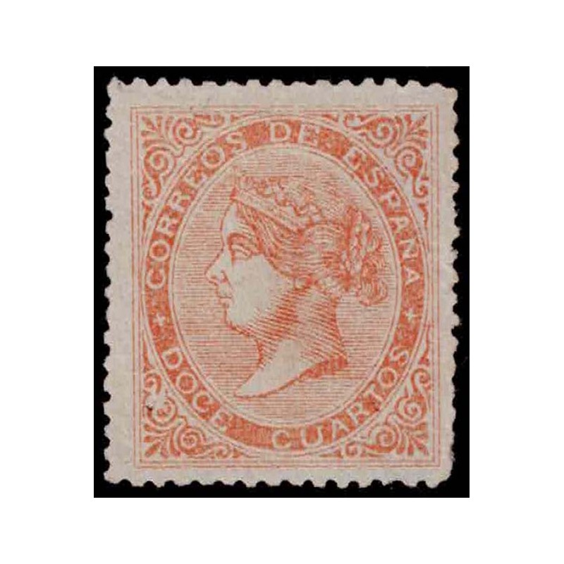 Isabel II. Raro falso postal del 12 Cuartos naranja nuevo.