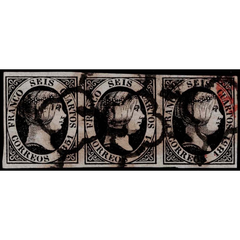Isabel II. Precioso trío horizontal del 6 Cuartos negro usado con matasellos Araña en negro presenta excelente color y amplios márgenes. Lujo.