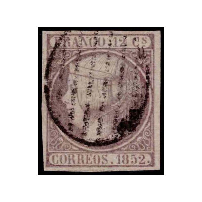 Isabel II. Raro 12 Cuartos gris-lila usado con matasellos Parrilla en negro presenta excelente color y buenos márgenes.