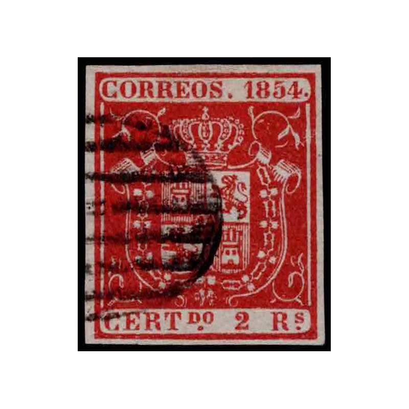 Escudo de España. Raro 2 Reales rojo variedad de papel grueso usado con limpio matasellos Parrilla en negro presenta magnífico color y amplios márgenes. Lujo.