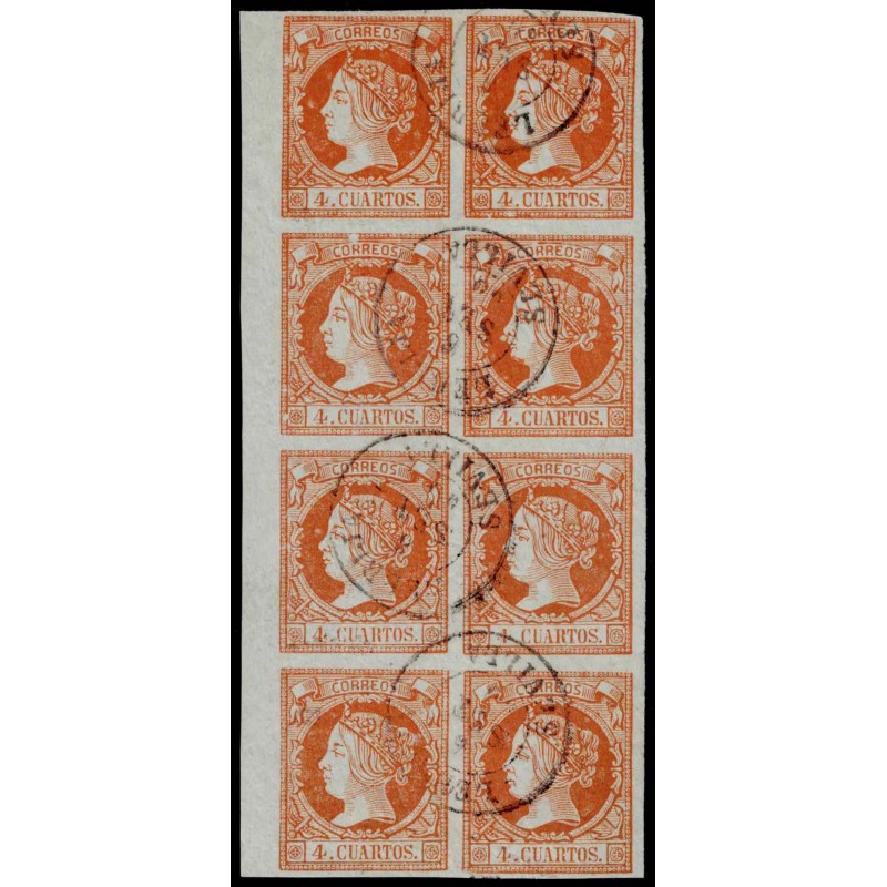 Isabel II. Muy raro bloque de 8 del 4 Cuartos naranja sobre papel verde con borde de pliego lateral izquierdo usado con limpios fechadores de Lebrija (Sevilla) en negro presenta excelente color y buenos márgenes. Gran lujo.