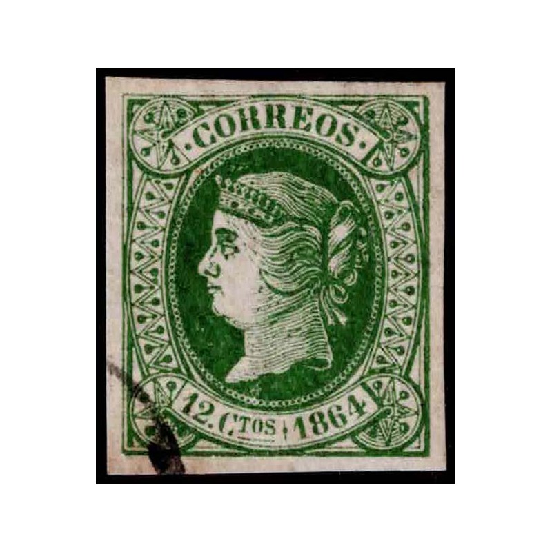 Isabel II. Precioso 12 Cuartos verde-oscuro sobre papel rosa usado con matasellos negro presenta magnífico color y amplios márgenes. Lujo.