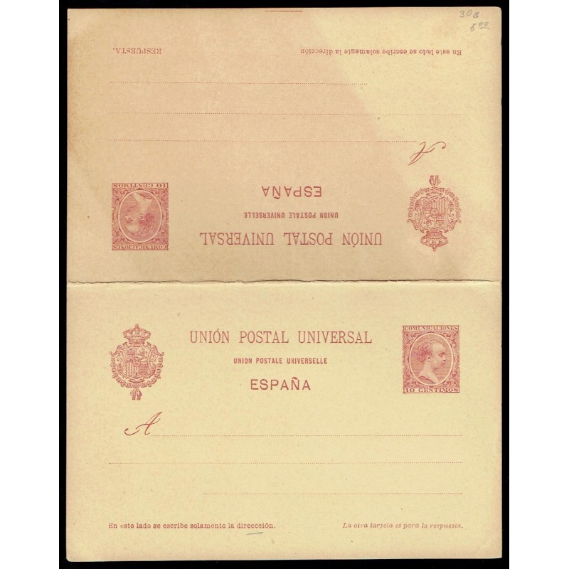 Alfonso XIII. Tipo Pelón. 7ª serie. Tarjetas para los Países de la Unión Postal Universal. 10c. + 10c. carmín sobre anteado con "dirección" con tres ces en la tarjeta de ida. Precioso entero. Raro.