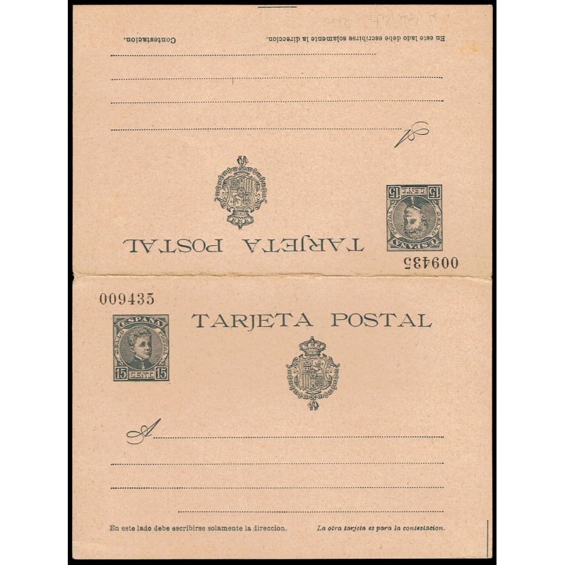 Alfonso XIII. Tipo Cadete. 1ª serie. Tarjetas para el Correo Interior. 15c. + 15c. pizarra. Precioso entero. Muy raro.