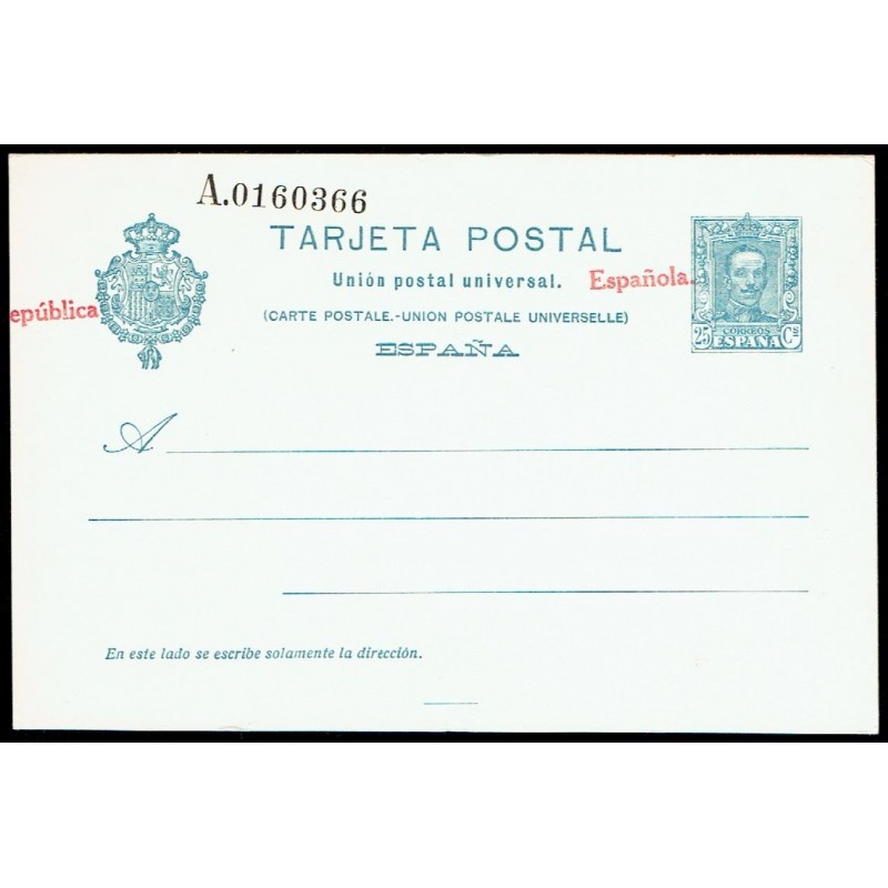 II República. Alfonso XIII. Tipo Vaquer. 2ª serie con habilitación "República Española". Tarjetas para los Países de la Unión Postal Universal. 25c. azul. Habilitación tipográfica en una línea. República Española en rojo. Variedad de composición habilitación desplazada a la izquierda. Raro.