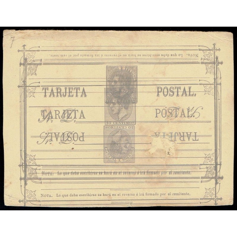 Alfonso XII. 2ª serie. 10c. violeta grisáceo de Tipo II. Entero con error por cuádruple impresión, una invertida. No catalogado.