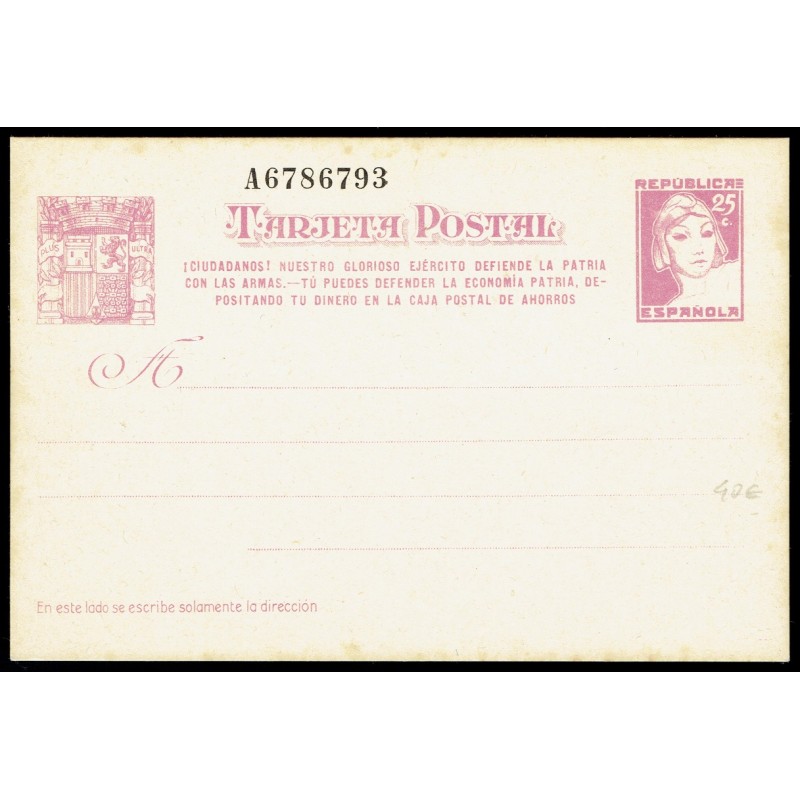 II República. Tipo Matrona con textos de propaganda. Tarjetas para el Correo Interior. 25c. lila sobre crema. Numeración de 7 cifras. Con texto "¡Ciudadanos! Nuestro glorioso ejército defiende la patria con las armas. - Tú puedes defender la economía patria, depositando tu dinero en la Caja Postal de Ahorros".