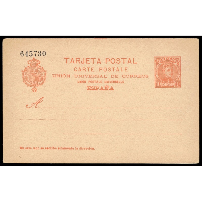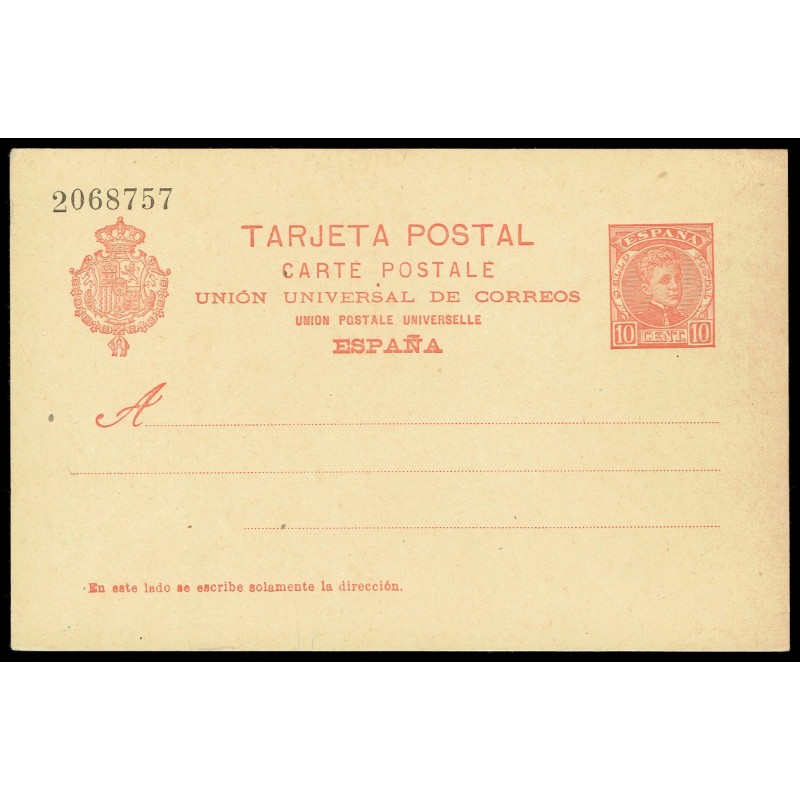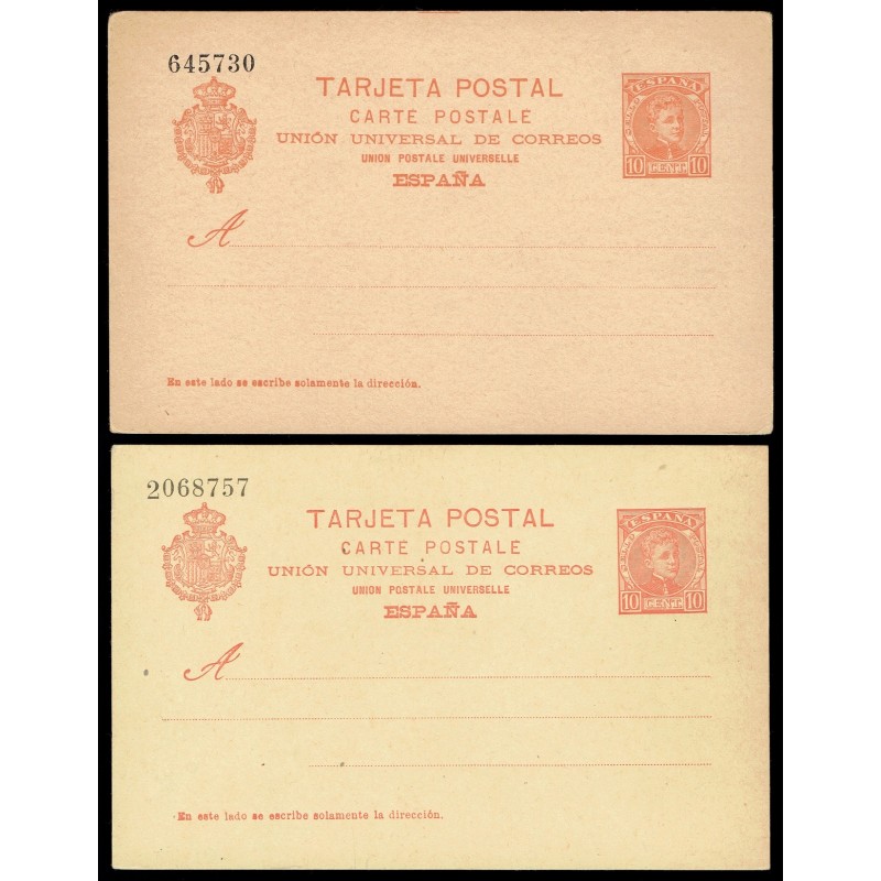 Alfonso XIII. Tipo Cadete. 4ª serie. Tarjetas para los Países de la Unión Postal Universal. 10c. rojo anaranjado sobre salmón con numeración de 6 cifras y 10c. rojo anaranjado sobre anteado con numeración de 7 cifras. Textos en cinco líneas. Preciosos enteros. Raros.