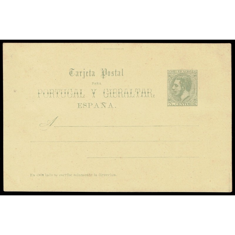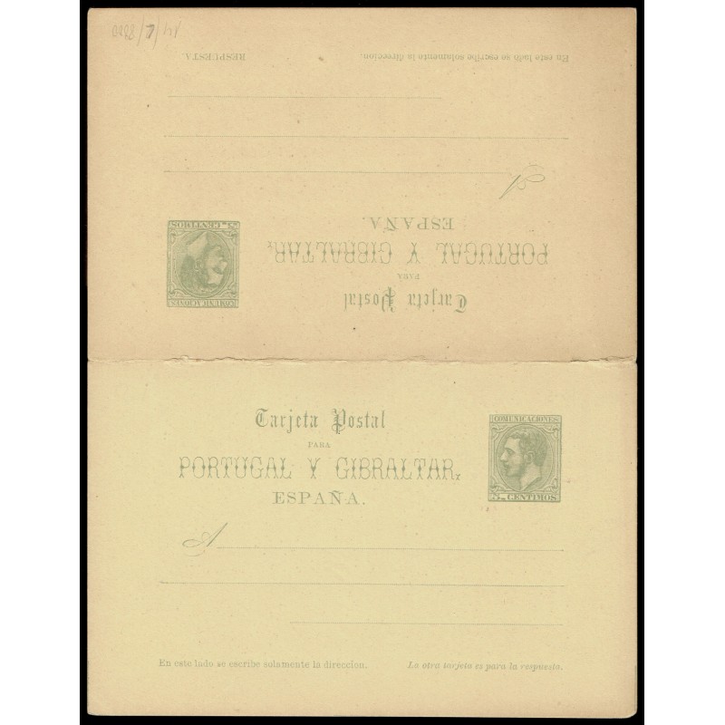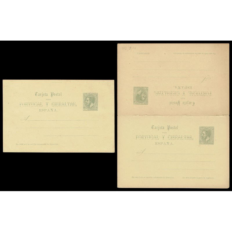 Alfonso XII. 3ª serie. Tarjetas para Portugal y Gibraltar. 5c. verde y 5c. + 5c. verde. Preciosos enteros. Raros.
