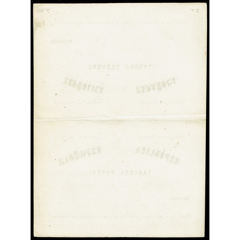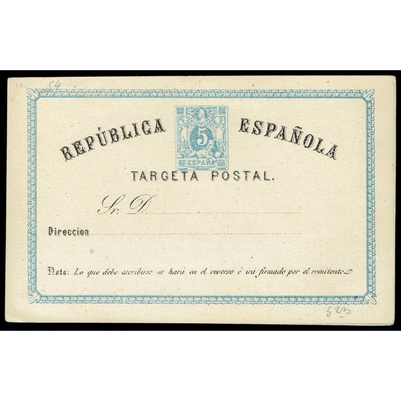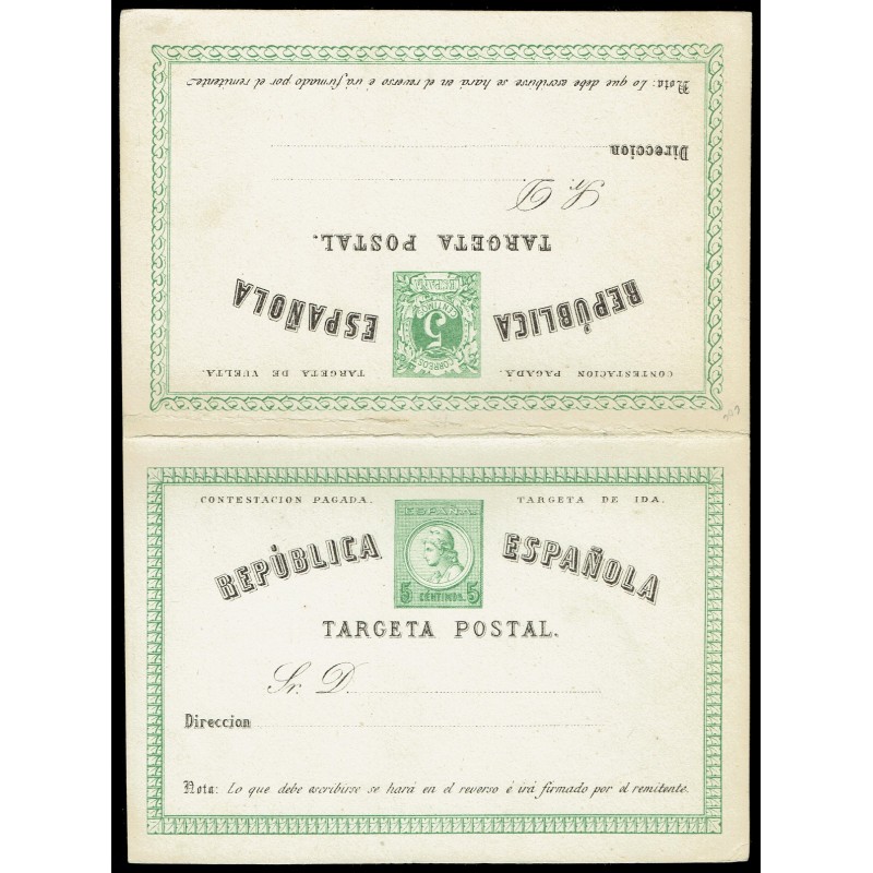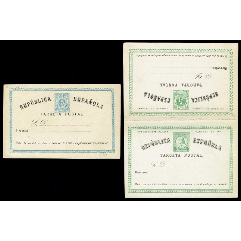 I República. Matrona y cifras. Tarjeta con G. Sin punto después de ESPAÑOLA. 5c. azul y negro y 5c. + 5c. verde y negro, Tipo I. Preciosos enteros. Raros.