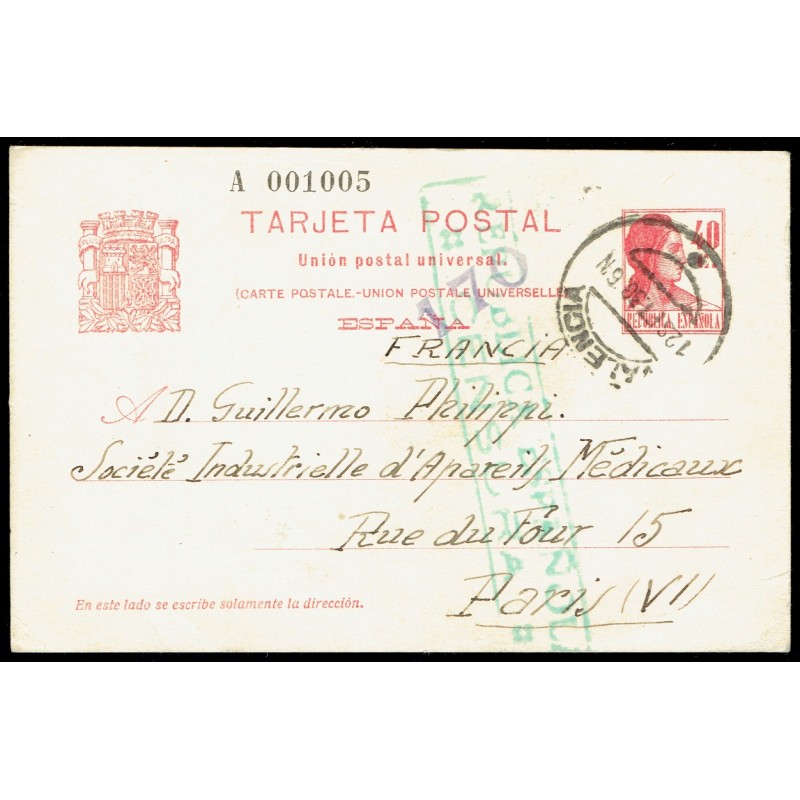 II República. Tipo Matrona. Tarjetas para los Países de la Unión Postal Universal. 40c. rojo carminado. Rarísimo entero circulado el 12 de Septiembre de 1938 de Valencia a París (Francia). Marca de censura militar.