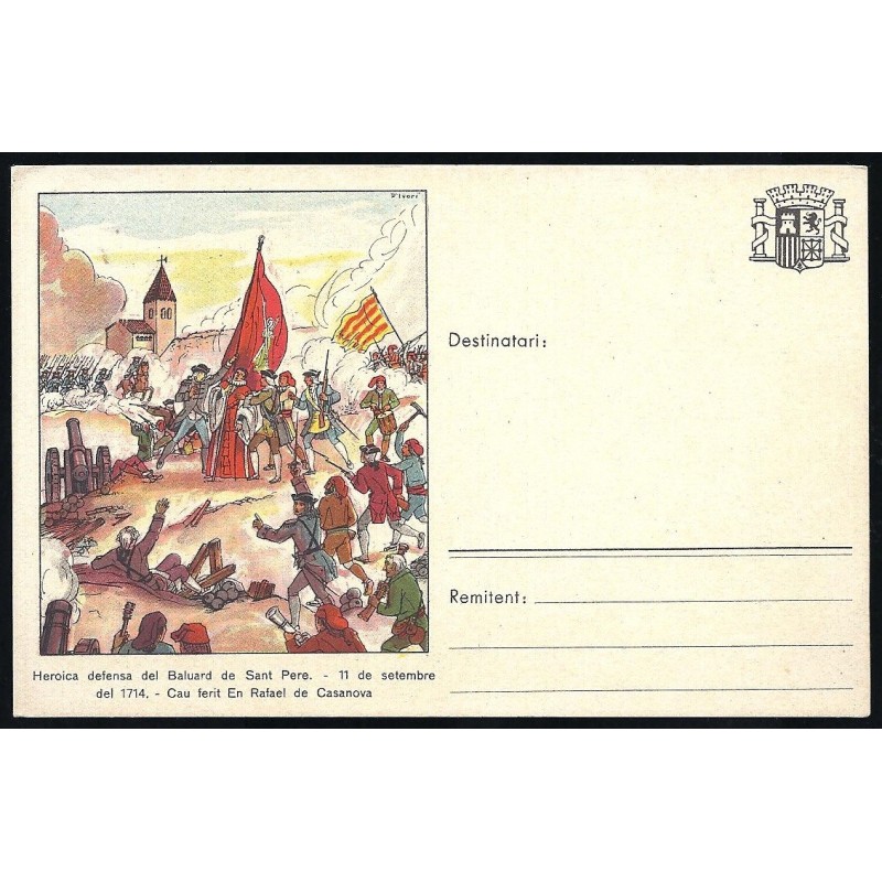 1937 Guerra Civil. Zona Republicana. Tarjeta Postal Editat pel Comissariat de Propaganda de la Generalitat de Catalunya. Dibujo con la representación de la "Heroica defensa del Baluard de Sant Pere. - 11 de setembre del 1714. - Cau ferit En Rafael de Casanova". Sin circular. Rara.