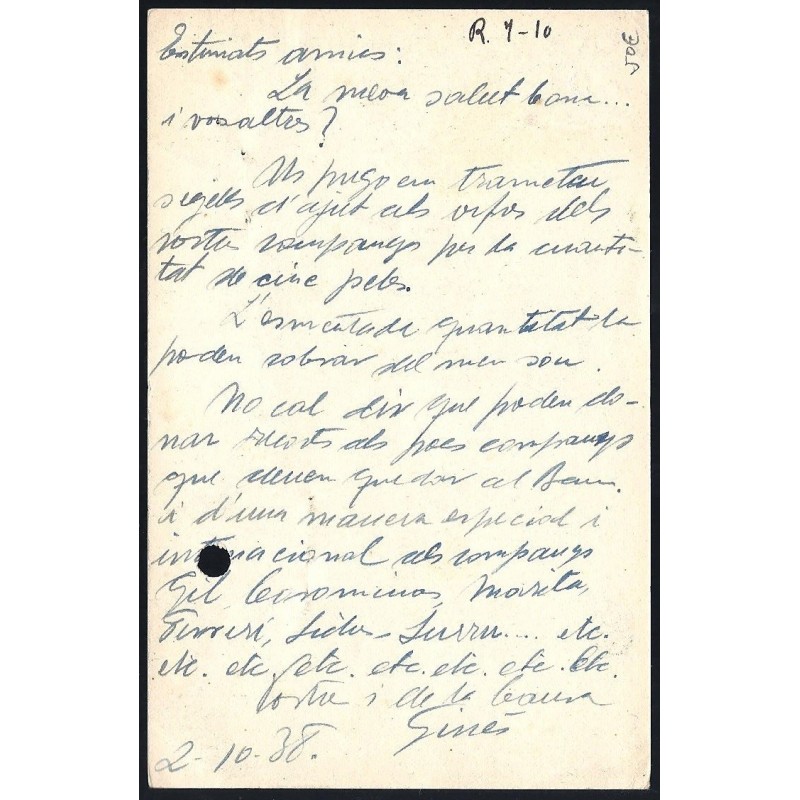 1938 Guerra Civil. Zona Republicana. Tarjeta Postal Editat pel Comissariat de Propaganda de la Generalitat de Catalunya. Dibujo con representación "Defensa de la barricada de la Plaça del Palau. - 11 de setembre del 1714". Circulada del frente a Barcelona. Fechada el 2 de Octubre de 1938. Franqueada con un ED. 685 y matasellada con tampón "Servicio Postal - Correos". Rara.