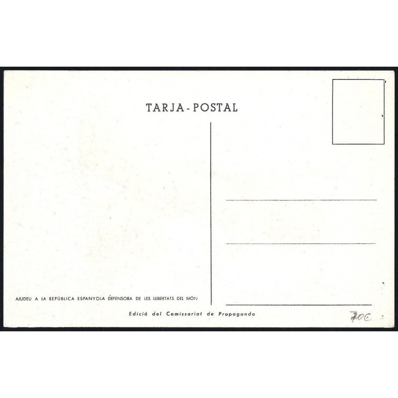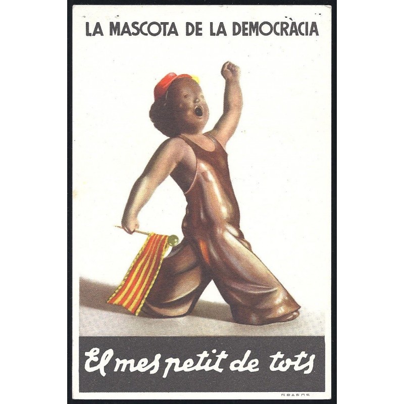 1937 Guerra Civil. Zona Republicana. Tarjeta Postal del Comissariat de Propaganda - Generalitat de Catalunya. Motivo "El más pequeño (la mascota de la revolución)" - "La Mascota de la Revolució - El mes petit de tots". Texto en el reverso en catalán "Ajudeu a la República Espanyola defensora de les Llibertats del Món". Sin circular. Rara.