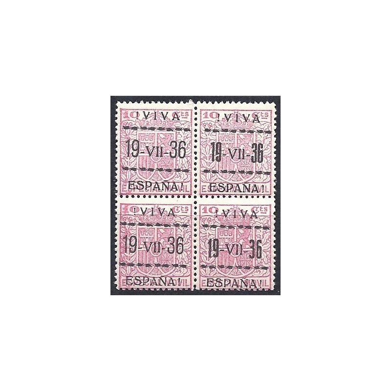 Sellos de 1923-1932 sobrecargados. Precioso bloque de cuatro 10c. rosa. Timbres Especiales Móviles. Escudo Corona Real. Valores con la sobreimpresión "!VIVA 19-VII-36 ESPAÑA!" de Tipo I+III y I+II en color negro, correspondiente a la emisión local patriótica de Vitoria. No Catalogados. Sellos nuevos y sin señal de fijasellos. Muy raros.